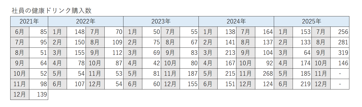 社員の野菜摂取量の数値を図ったところ、平均値が8に対し社員平均は3.5と大幅に野菜摂取量が足りていなかったことから、当社では社員一人ひとりが気軽に野菜を摂取できるよう、1日の接種目標値とされている350gのうち一般的に不足とされている68.6gを補うための「スムージー」や目に良いドリンク等の社内販売をしております。また、健康アプリを活用して、毎日の食事管理を行っております。
