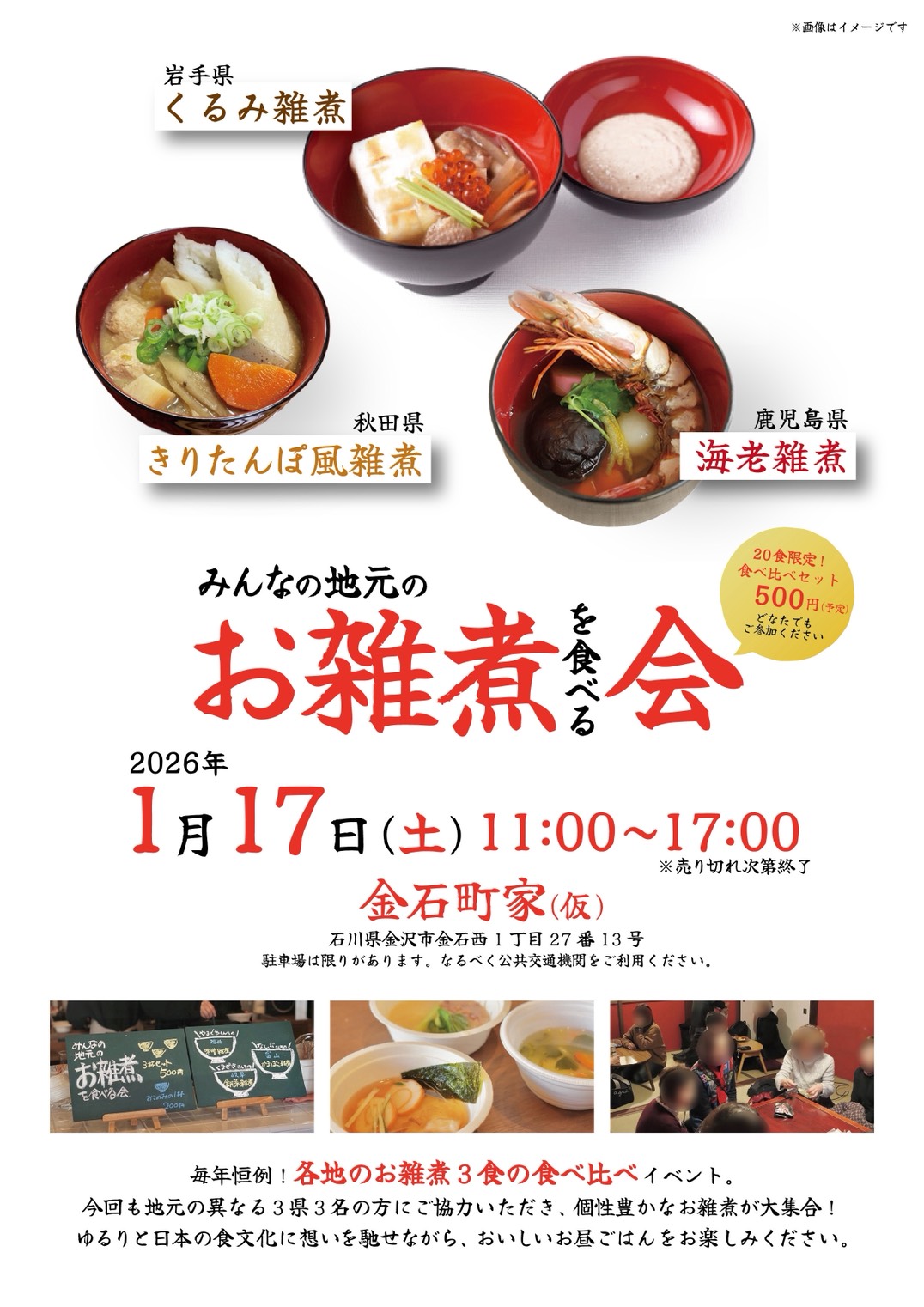 金石町家(仮)では毎年、全国のお雑煮を食べ比べる会を開催しています!