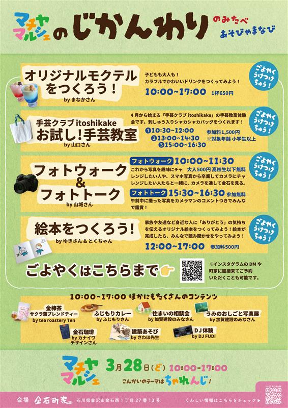 テーマはチャレンジ! カメラマンさんとカメラを持ってまちをあるく『フォトウォーク』や、4月から始まる『手芸クラブitoshikake』のお試し手芸体験教室、絵本をつくるワークショップ、前回のお正月イベントで好評だった『建築あそび』など、さまざまな体験ができます!飲食ブースでは、当社が自家焙煎した棒ほうじ茶の新商品“サクラ葉ブレンドティー”を提供します!他にもカラフルでかわいいオリジナルのモクテルをつくる体験、カレーや珈琲などもあります。