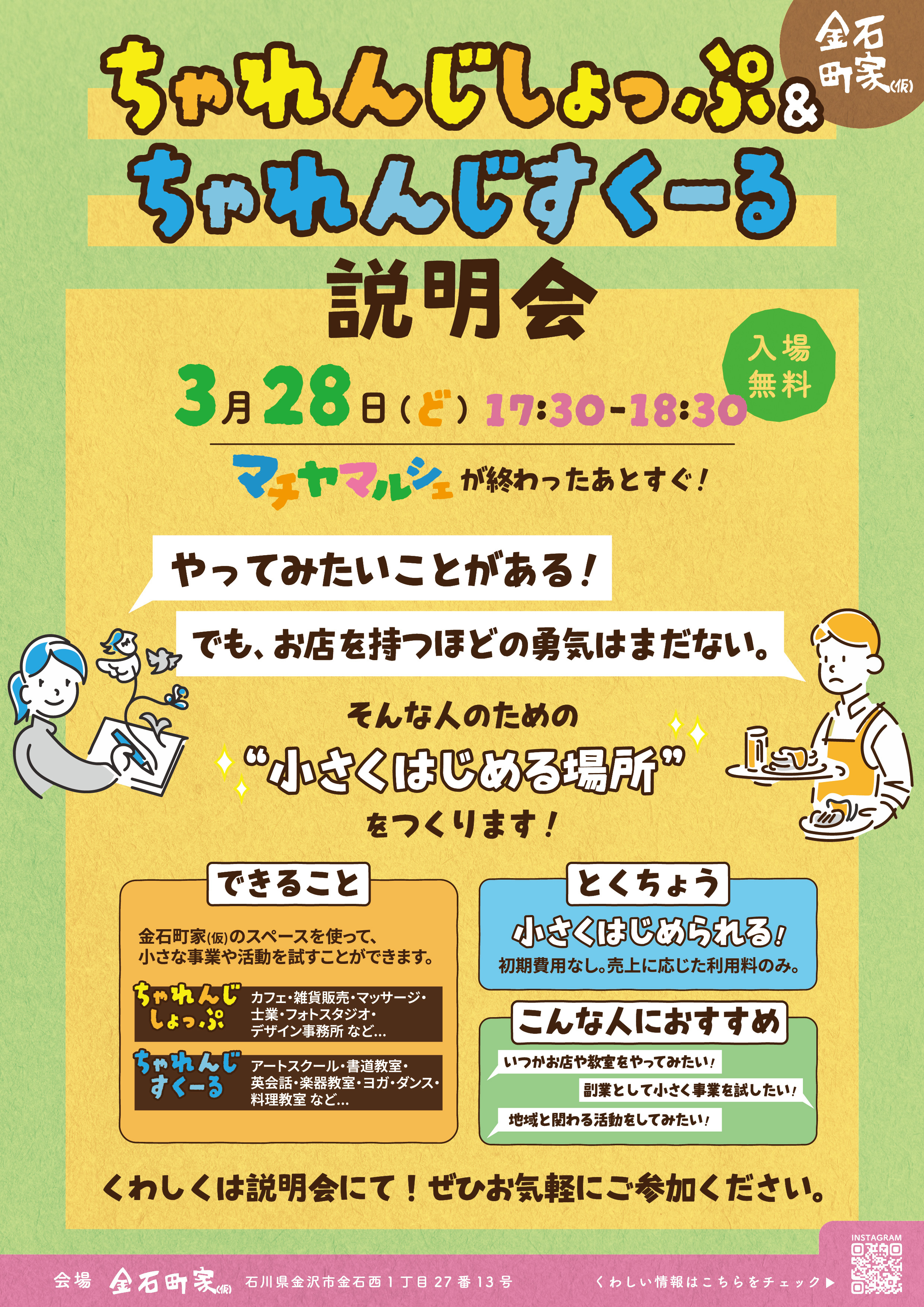 またマチヤマルシェ終了後には、町家で小さな事業や活動に挑戦する人を支援する制度『ちゃれんじしょっぷ&ちゃれんじすくーる』の説明会もございます!